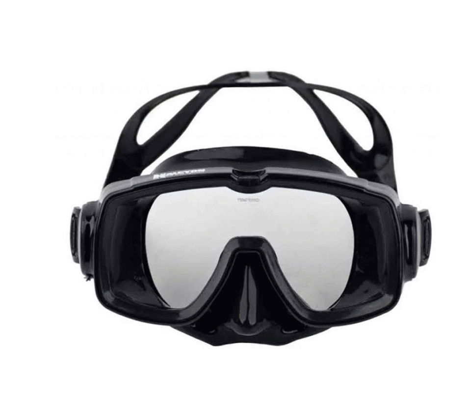 The black frame and silicone skirt fit snugly around the single lens, creating a low-volume mask for easy cleaning and minimum drag.