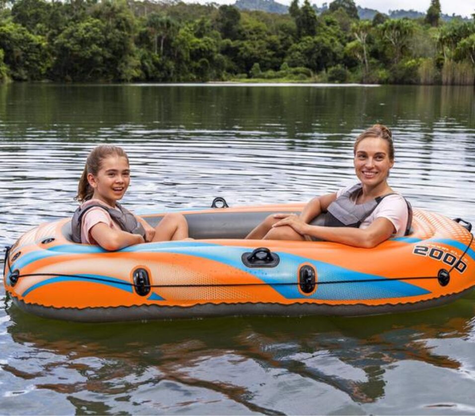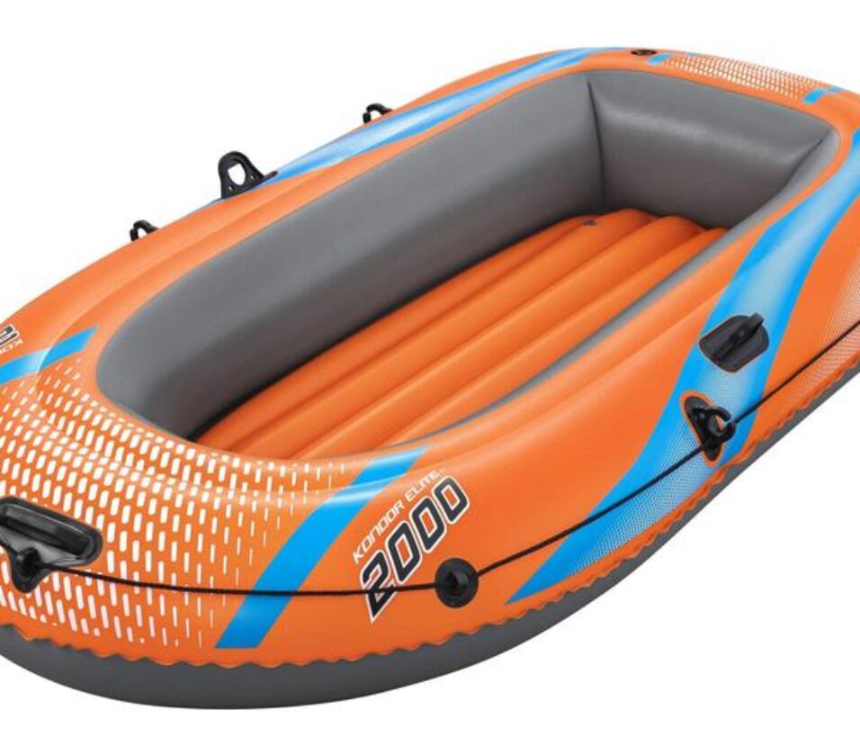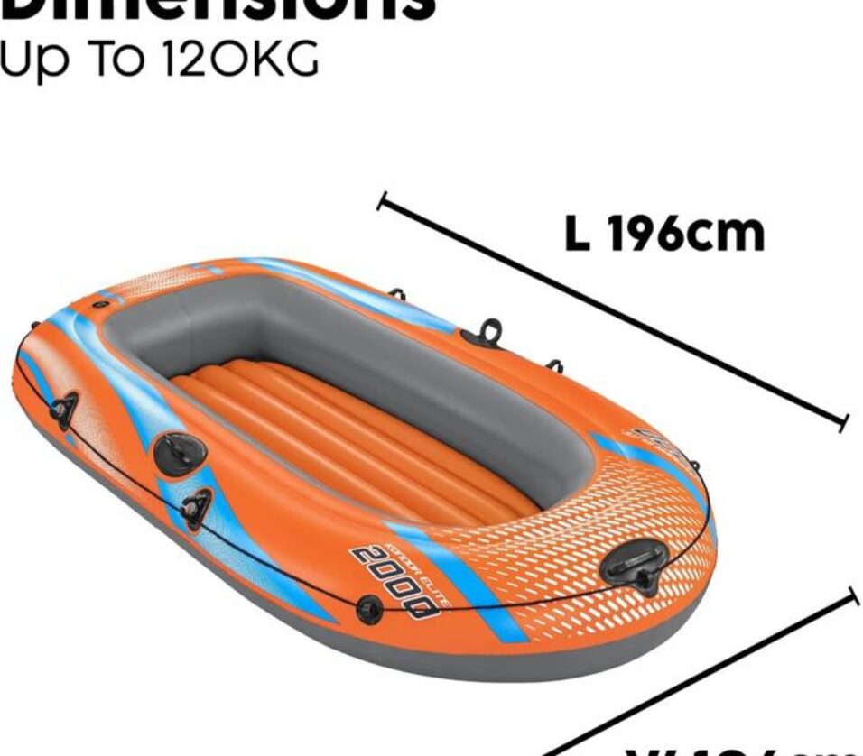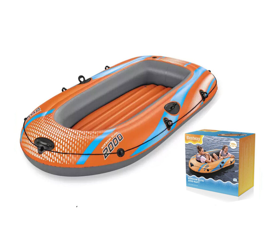 The Bestway Kondor Elite 2000 is a fun-filled inflatable raft for families looking to explore the water together! Perfect for one child and two adults (with an overall weight capacity of 120 kg) and featuring a highly visible orange color, it's easy to inflate so you spend less time setting up and more time on the water. The raft features an added layer of protection with its double air chamber construction and a comfortable, padded inflatable floor for added relaxation and stability. A handle attached to the front of the raft ensures convenient transportation around the lake or pool. Additionally, oarlocks built into the sides of the raft will help keep paddles (not included) in place, and a handle strap wrap with built-in grommets allows you to dock the raft, connect with friends, and easily re-enter the raft from the water. From paddling to fishing to simply floating along, this raft promises a summer to remember. Easy to use and easy to transport, the Kondor Elite 2000 raft is no problem for your next day on the water!Feature: