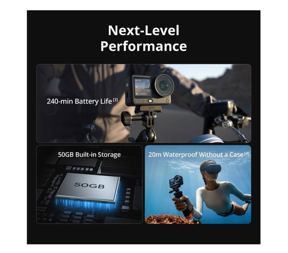Capture crystal-clear, ultra-stable video in up to 4K120 resolution wherever you go with the DJI Osmo Action 6 Standard Combo. This action camera features a new 1/1.1” square sensor, Starburst mode, variable aperture from f/2 to f/4, and 50GB of internal storage. It’s also designed to perform better in cold environments.
