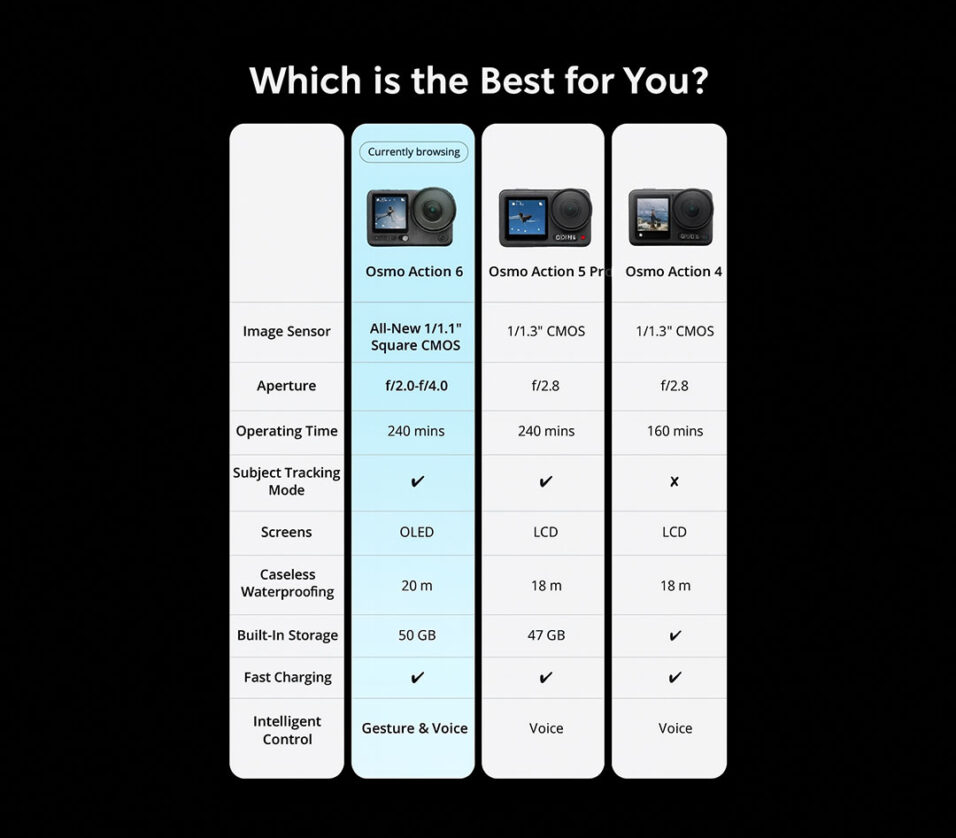 The Osmo Action 6 retains its bright dual OLED screens, RockSteady and HorizonSteady stabilization, 38MP sensor, 4-hour battery life, and waterproof body with water pressure gauge.