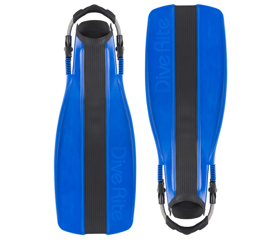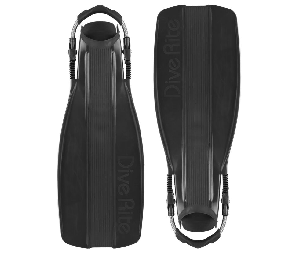 The blade shape is designed for a wide variety of kicks, including frog kicks, modified flutter and power kicks. They are stiff, yet with plenty of snap and are lighter in weight than traditional rubber fins, meaning legs and feet won't cramp even after miles of swimming. The 12-inch pliable marine grade stainless steel spring-heel strap allows for quick donning/doffing. A molded heel pad provides comfort, while low profile finger hold add to the ease of use without creating snag points.