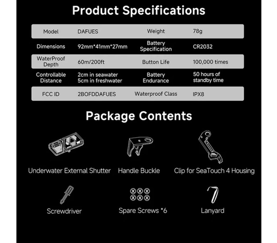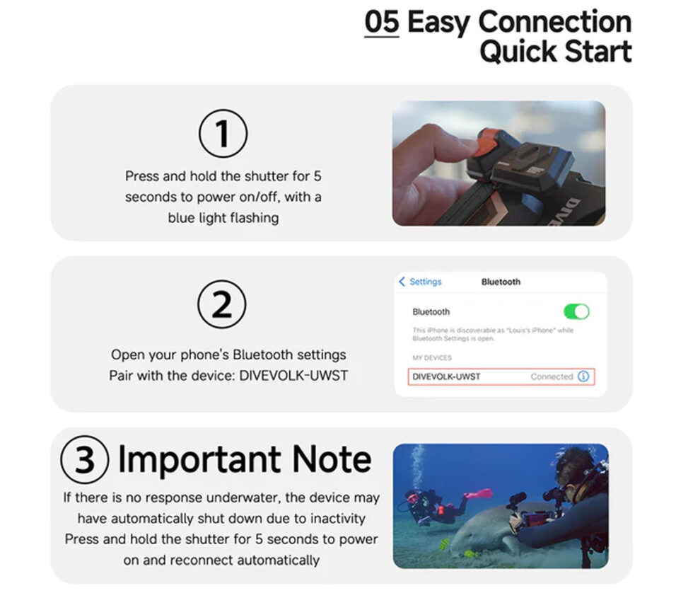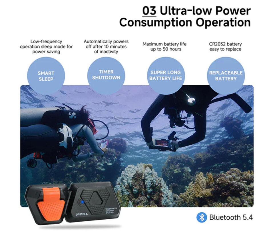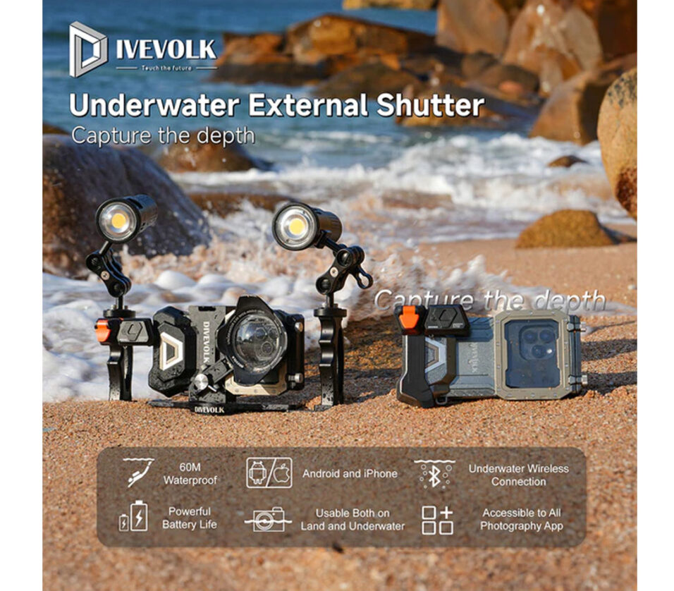 Unlock full control beneath the waves with the DIVEVOLK External Bluetooth Shutter, designed specifically for the SeaTouch 4 Max Series Housing! This compact yet powerful shutter key allows you to capture stunning photos and videos effortlessly—both on land and underwater—via seamless Bluetooth connectivity. Engineered for divers and ocean enthusiasts, it supports third-party photography apps and offers multiple mounting options for handles and trays. With ultra-low power consumption and auto sleep mode, it’s built to last through more than 100,000 presses and withstands depths up to 60 meters. Whether you’re snorkeling or deep diving, the DIVEVOLK Shutter brings ergonomic precision and reliability to your fingertips. Perfect for Android and iPhone users.Features :