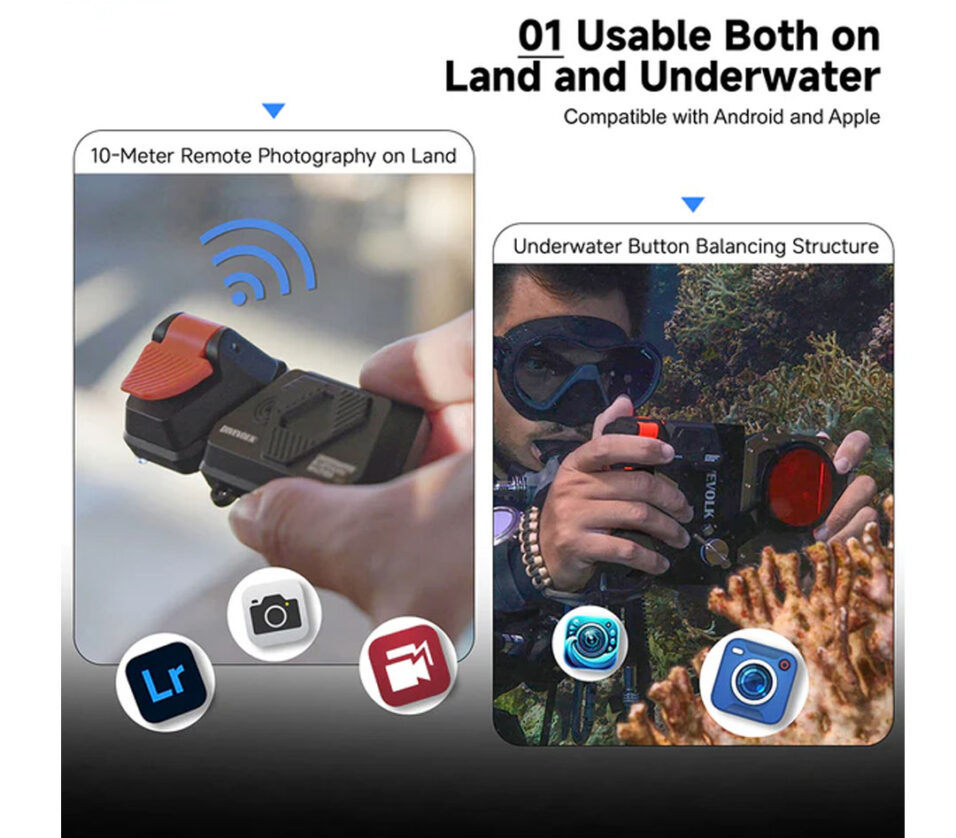 - 【Usable Both on Land and Underwater】 It's designed to control the camera shutter to take picture,video and even access to thrid party photography APP by Bluetooth underwater