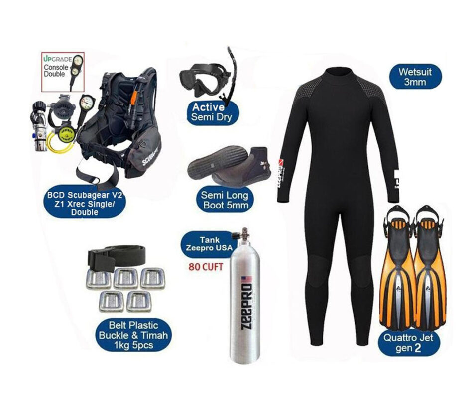 Include: * BCD Scubagear V2 * Regulator MK1/Z1 Xrec * Octopus Xrec * Console Zeepro Single/Double * Wetsuit Zeepro SBR Dive Center 3mm * Mask Zeepro Active * Snorkel Zeepro Semi Dry * Fin Zeepro Quattro Jet Gen2 * Booties Zeepro Semi Long Boot * Tabung Zeepro USA 80 Cuft * Weight Belt Zeepro Plastic Buckle * 5pcs Timah Pemberat Import1kg Fin: Color - Size: Orange, Blue, Yellow - Reg Booties: Ready Size : 1-13 Wetsuit: XXS XS S M L XL XXL BCD Scubagear: Lift buoyancy capacity : XS = 120N / 27,1Lbs S = 140N / 31,4Lbs M = 170N / 38Lbs L = 175N / 39.3Lbs XL = 180N / 40.4Lbs