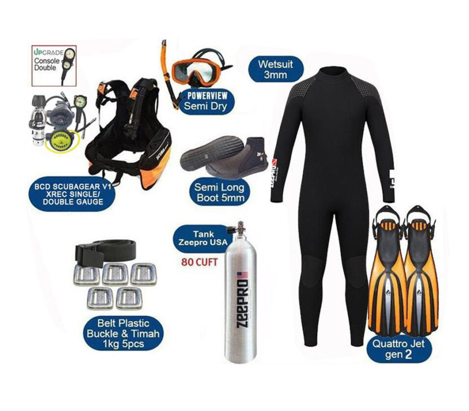 Include: * BCD Scubagear V1 * Regulator MK1/Z1 Xrec * Octopus Xrec * Console Zeepro Single/Double * Wetsuit Zeepro Dive Center SBR 3mm * Mask Zeepro Vader Powerview * Snorkel Zeepro Semi Dry * Fin Zeepro Quattro Jet Gen2 * Booties Zeepro Semi Long Boot * Tabung Zeepro USA 80 Cuft * Weight Belt Zeepro Plastic Buckle * 5pcs Timah Pemberat Import1kg Fin: Color - Size: Orange, Blue, Yellow - Reg Booties: Ready Size : 4-13 Wetsuit: Full Black XXS-XXL BCD Scubagear: Lift buoyancy capacity : XS = 120N / 27,1Lbs S = 140N / 31,4Lbs M = 170N / 38Lbs L = 175N / 39.3Lbs XL = 180N / 40.4Lbs