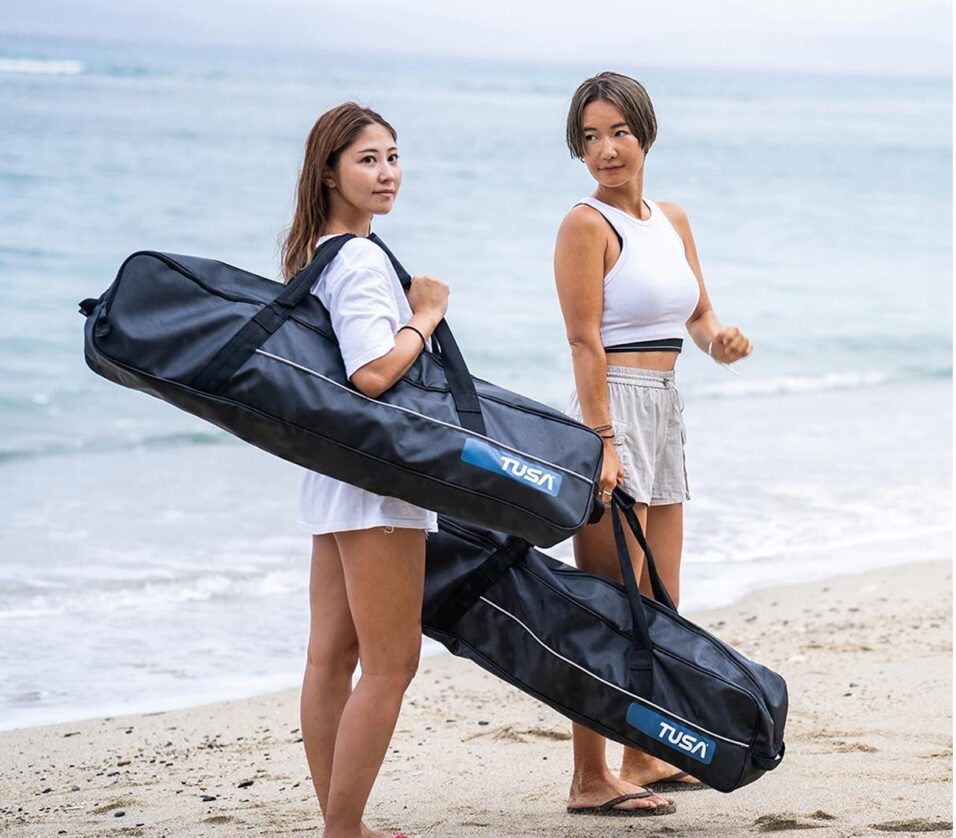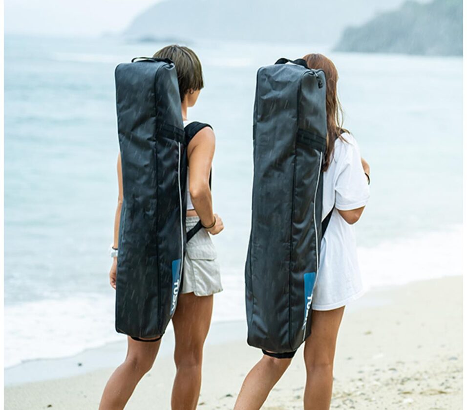 The Long Fin bag features shoulder pads, making it comfortable and easy to carry. It is made from quick-drying tarpaulin material, ensuring durability and water resistance. Additionally, it includes a front pocket for storing small items and an inner pocket to help keep everything organized.- Comes with shoulder pads for easy carrying