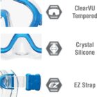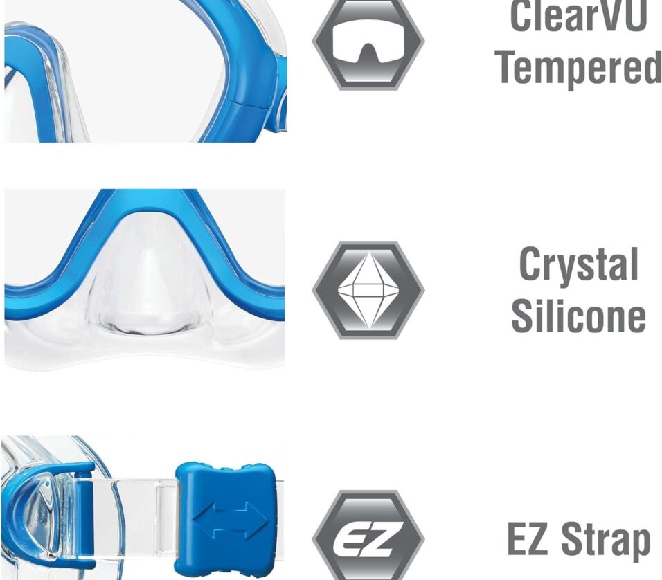 The UC0211P KLEIO mini FIT youth mask and snorkel combo include a 1-window mask with new 'fitting ring' that creates a seal like no other mask and a newly designed strap and buckle system, ClearVu tempered glass lens and pure silicone skirt. The snorkel features TUSA Hyperdry technology that reduces water flow into the snorkel, Pure Silicone mouthpiece, and a flexible silicone joint that reduces strain on the mouth. Fits ages 6-12.