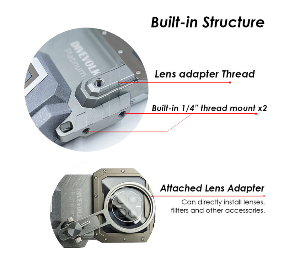 Underwater Case Housing Handphone Divevolk Seatouch 4 Platinum DAEDP The Seatouch 4 Max Platinum Edition features a reinforced metal body, integrated connection base and M67 Lens Adapter Ring.