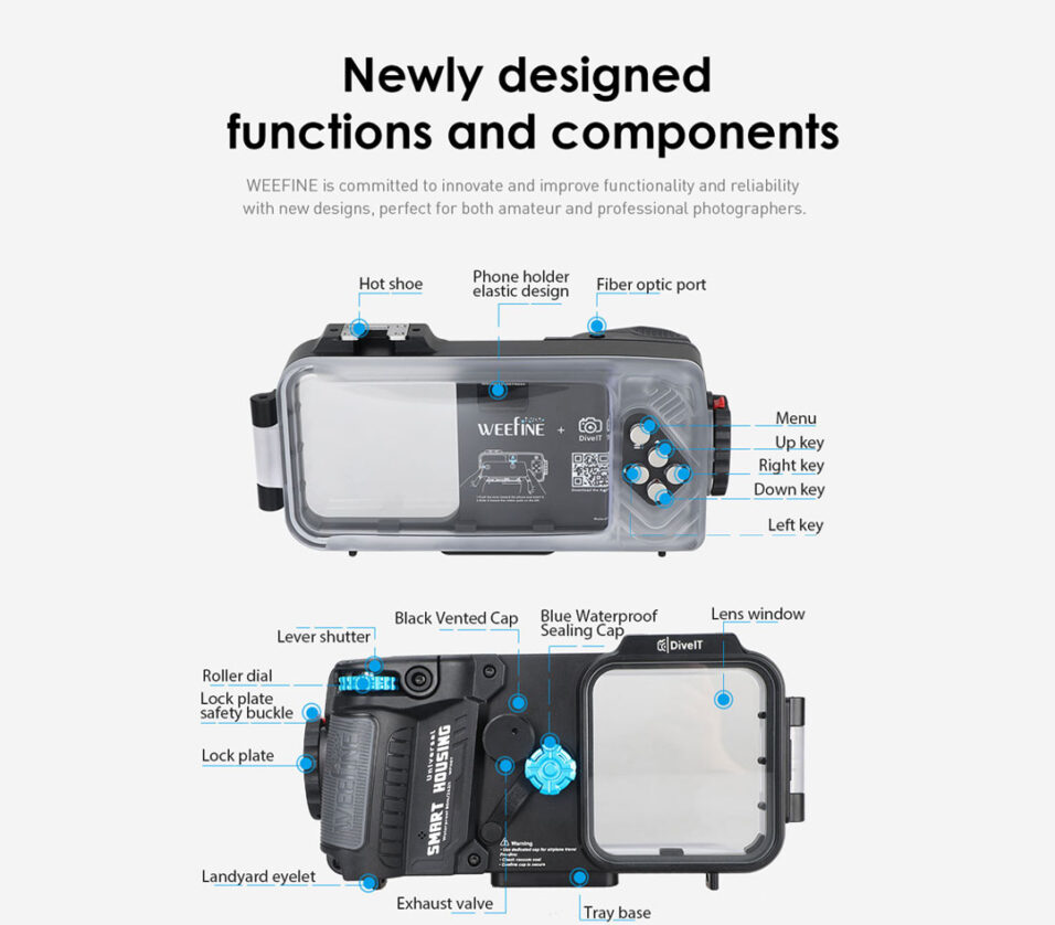The Weefine WFH07X Universal Smartphone Housing is a precision-engineered underwater smartphone housing designed for divers who require reliability, functionality, and compatibility across various smartphone models. Constructed mainly from aluminum alloy, the housing provides durability and depth-rated protection for smartphones used in challenging underwater conditions.
