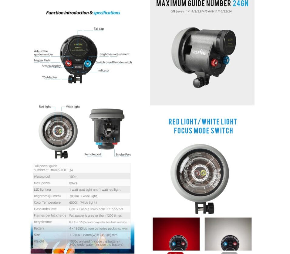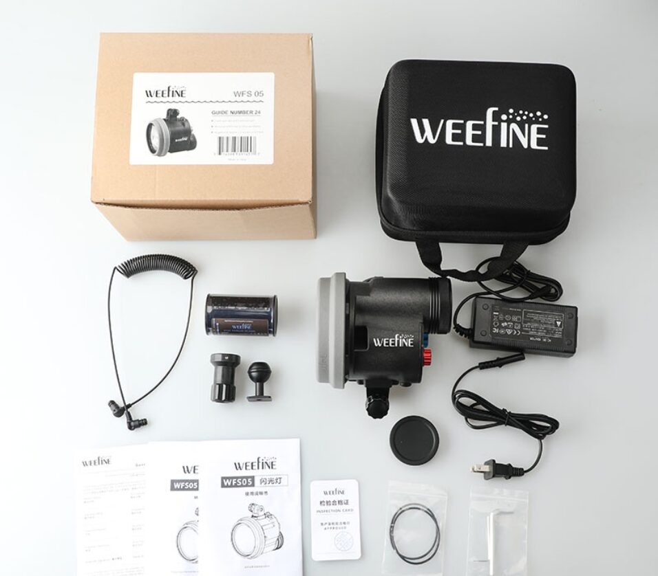 WFS05 Ring Strobe The Weefine WFS05 ring strobes are specifically designed for underwater use to provide the most colorful and natural wide-angle lighting on the market. A professional grade round flash tube and powder coated reflector produce perfectly a soft, stunningly warm 5500K light. An underwater flash that leaves nothing to be desired. Fast, strong, perfect light. Automatic correct exposure. Simple: an all-round carefree package. Extra-large flash capacitors and a special rechargeable battery ensure high speed and extremely long battery life. The device runs forever. Key Features: Full power guide number at 1m/ISO 100: 24 Color temperature: 5500K Beam ange of coverage underwater: 90 degrees LED lighting: 1 watt spotlight and 1-watt red light GN levels: / 1/1.4/2/2.8/4/5.6/8/11/16/22/24 Flashes per full charge : 1200 times at full power flashes Recycle time: Approx. 1.5 seconds at full flash Battery: 14.8V 50.32Wh Li-ion batteries pack Depth rating: 100m Connection: optical connection (for flash cable as well as remote control) LCD-Display At the rear of the WFS02 strobe there is a small LCD-screen which permanently displays the number of remaining flashes. You can also see briefly whether you are in manual flash mode or in TTL sync mode. Long running time The Weefine WFS02 sets a new standard for underwater strobes, it can trigger over 1000 flashes with GN24 per battery charge. Remote control This innovative underwater strobe can be remoted controllable. The strobe unit allows the pilot lights (red/white) to be switched on, off, from red to white and the luminosity to be adjusted. The strobe intensity can also be adjusted with the optional remote control. The strobe unit can also be switched from manual flash mode to synchronization mode (TTL). The professional ring flash offers excellent, absolutely even light. With the ring flash typical homogeneous very natural looking light. Focus lights The Weefine WFS02 is equipped with two focus lights. The built-in modeling light automatically turns off and back on when taking a still photo to avoid over exposure.Focus light red dimmable in 10 steps (the corresponding power is displayed on the LCD-display) Focus light white dimmable in 10 levels (the corresponding power is displayed on the LCD-display) Connections There are two optical sockets at the bottom of the strobe. One is for the main fiber optical cable that comes from the housing, the other is for the optical cable that comes from the optional remote controller Included in the delivery is a practical tool that can be attached to the control knobs in order to operate the rotating wheels better with thick gloves.| Category | : | BEST DEALS |